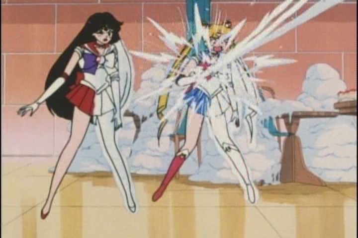 Sailor Moon and Sailor Mars are the first hit with the icing ray, which turns half of them into, you know, sugar I guess.