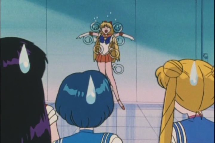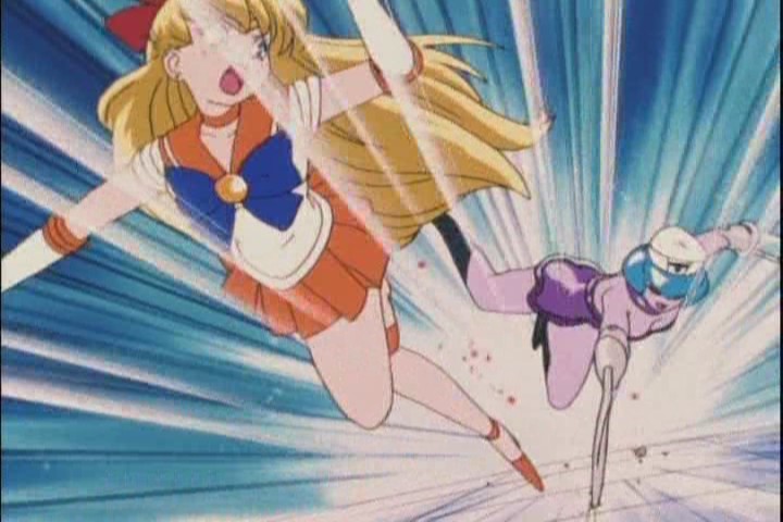 The energy blast alerts all the Senshi to the situation, and the first on the scene is, naturally, Sailor Venus.