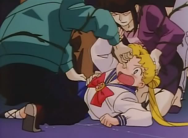 When Sailor Moon begins to de-transform, he is now just touching her naked boobs. Gross.