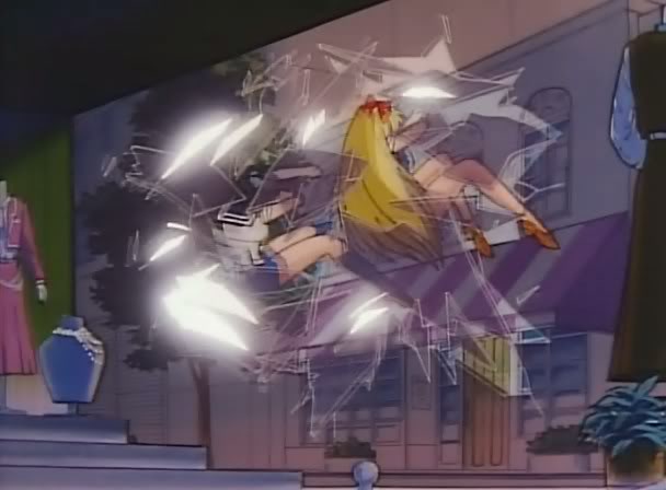 All this kerfuffle is thanks to that ugly plant, which promptly grows legs and tries to eat Chibi-Usa. Usagi has a brilliantly heroic moment of crashing through a cafe window to save her (not the best of plans with all that broken glass). This actually looked really fucking cool.