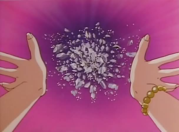 Fiore tries to kill her regardless, but Tuxedo Kamen, having spent the last hour trying to break out of his stupid crystal, finally manages to throw a single rose into Fiore’s chest. Once again, copying from the first season.