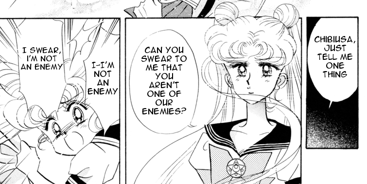 There’s a moment when Usagi make’s Chibi-Usa swear that she’s not their enemy. Chibi-Usa, tearful and scared, yells that’s she’s not. The anime Usagi would have the compassion and naive belief in others that’s such a strong, if flawed, part of her personality.