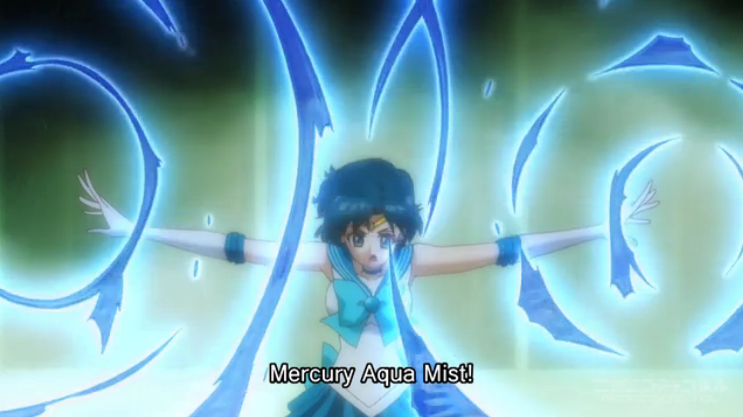 I mentioned that Sailor Mercury’s transformation sequence was an affront to the eyes, but her first attack, Mercury Aqua Mist, is far better than poor old Bubble Spray. Mist-drawing technology has come one quite a way in 22 years.