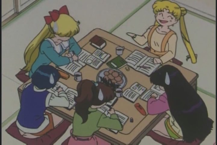 The girls are all studying for the high school entrance exams (this is truly one of the most gruelling and high-pressure times in a Japanese teenager’s life), which explains why Usagi was asleep. ‘Atta girl.