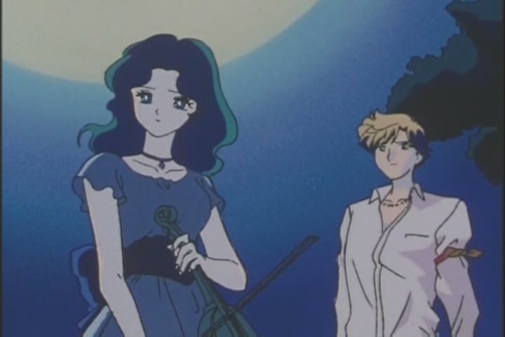 Michiru playing the violin in the park. In the middle of the night. Yes, this is a lovely moment, but… what? Well, far be it from me to question what the hell she’s doing.