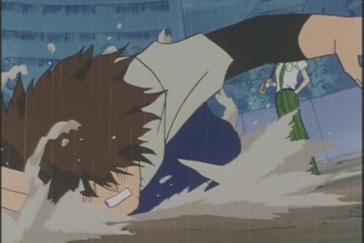 Despite the fact that the previous night was completely clear, Yuichiro waits until it’s nice and thunderstormy to call Haruka out to an abandoned lot for a fight.