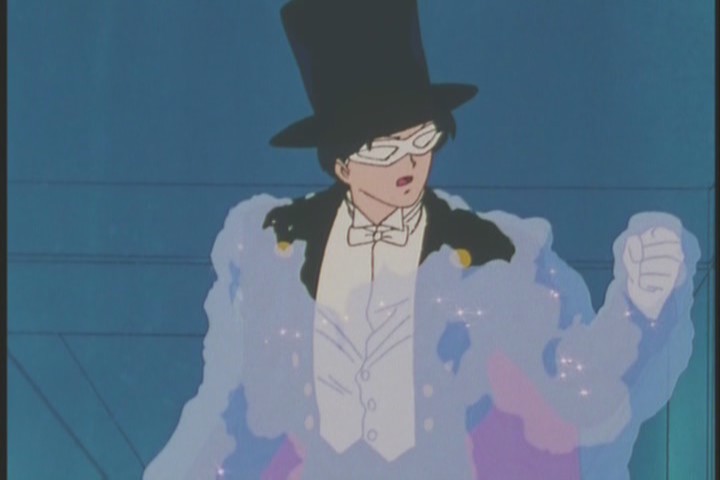This looks rather crap, actually, but the result is that Tuxedo Kamen is frozen in glass.