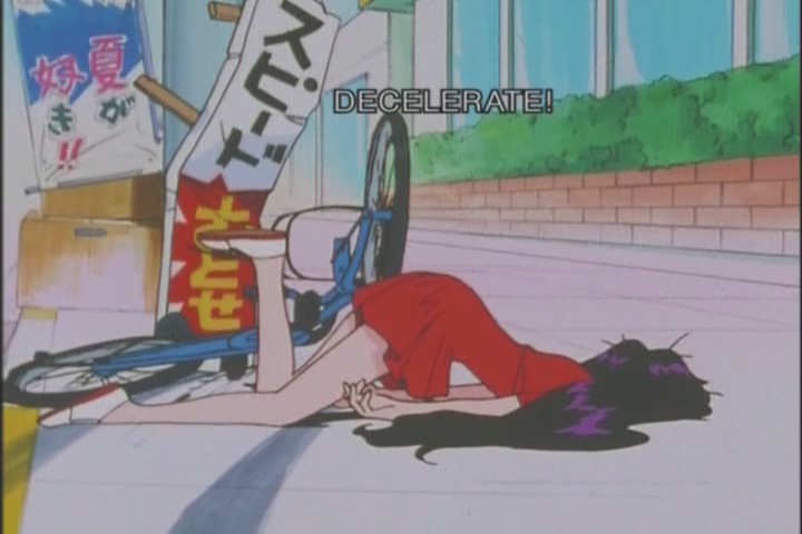 Rei, looking absolutely insane, smashes her bike into a sign. Seriously, she looks fucked up from that. Considering how austere and haughty she normally acts, this moment of utter embarrassment (which reminds me of the time she picked up Mamoru) is just side-splittingly funny.