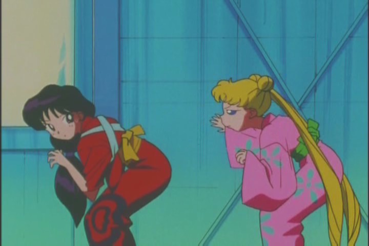 Usagi goes looking for Rei, who looks lovely in her red yukata… albeit a little put out at having been caught snooping through an open window. Seriously, these girls think alike.