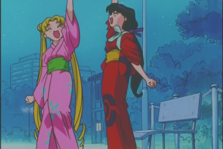 In an overly dramatic fashion, Haruka and Michiru turn up wearing yukatas, and my don’t they look lovely. The animators make sure we realise it too, doing a quadruple take to emphasise their beauty. Easy there, camera man. I’m assuming this is a running gag for them. Or at least, I found it hilarious.