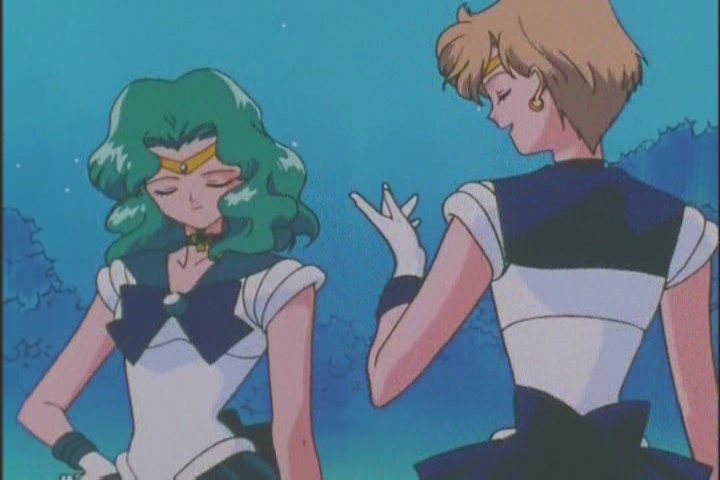 Eugeal, sated, turns to the Pure Heart again, only to find Sailor Uranus and Neptune in her way. JESUS she can’t catch a BREAK. Poor woman.