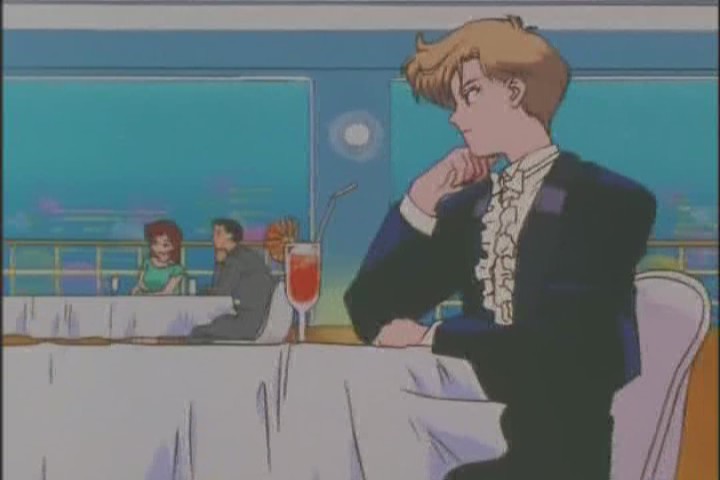 We’re in Tokyo Bay, aboard a cruise ship, and Michiru is playing her violin expertly as Haruka watches on in a tux, looking moody. I love how she’s always rocking an attitude.
