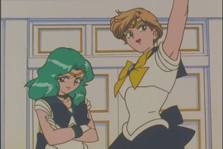 Just to be sure, Sailor Uranus and Sailor Neptune come blasting in, as usual. They like to attack first and introduce themselves later.