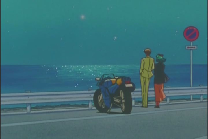 Haruka and Michiru, mollified that they were being jumpy, begin to walk off set to the familiar romantic music and dramatic freeze-frame…