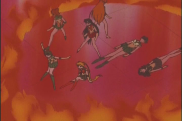 There’s some faffing about with this flame ring: Sailor Mercury has ONE JOB to do, put fires out with water, and she fails to do that, exciting the flames more instead. GREAT WORK, MERCURY. Honestly, the Inner Senshi are completely debuffed this entire season. Only Jupiter got the chance to truly lay the smack-down on an enemy.