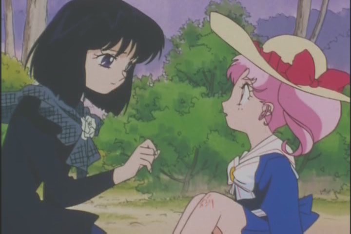 Chibi-Usa and Hotaru are reuniting after the brief but insane battle (Hotaru doesn’t question it in the slightest) when Hotaru notices a graze on her new friend’s leg.