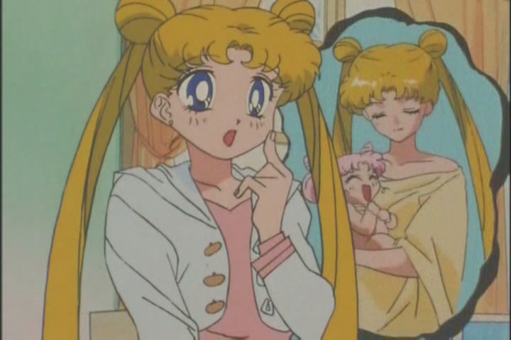 Minako then brings up the fact that Usagi should be more motherly towards Chibi-Usa, leading to a rather interesting little daydream for Usagi. They so rarely make use of the fact that the girls are, in fact, mother and daughter, that moments like these are to be cherished.