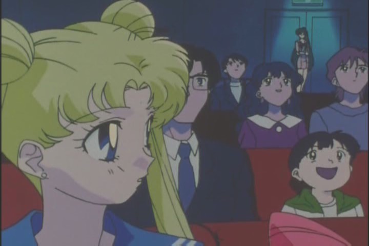 Usagi, enjoying the show, sudden has a weird flash of Setsuna’s eyes, and she’s aware of her presence at the back of the room. I really like this moment, it suggests powers from Setsuna that aren’t concrete. She’s so mysterious. I like the subtle way they did this too. Nice work.