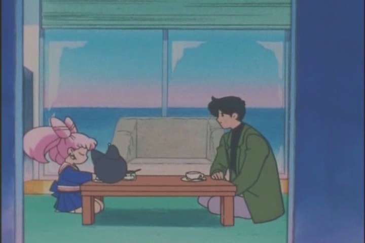Chibi-Usa does whatever she doesn’t when she’s pissed off with Usagi, she ends up at Mamoru’s place, and they have one of those awkward conversations where Chibi-Usa thinks everyone hates her.