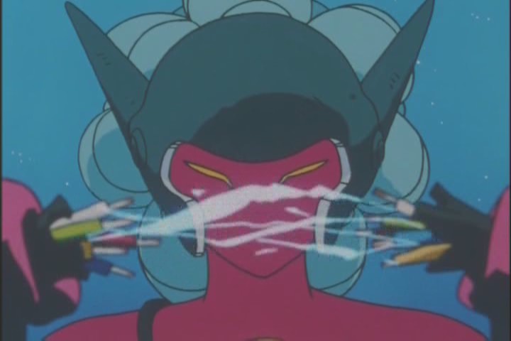 Tuxedo Kamen, in an attempt to be relevant, decides to finally help out and throws a rose which embeds itself into the helmet of Rangy and knocks her down.