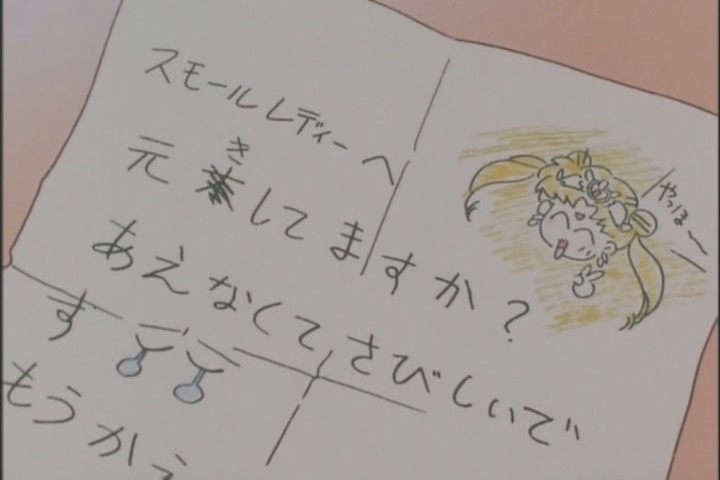 Luna-P reappears with another letter, with a much better picture in it this time, but equally awful writing, thanking Chibi-Usa for the souvenirs (so in other words they stole those crappy farewell presents from her), telling her not to be too much of a nuisance (she will be) and telling her to bring back more presents next time.