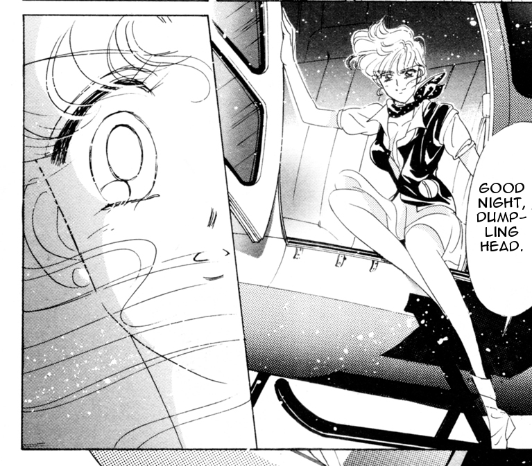 I’m not crazy about Haruka’s tactics with how she flirts with Usagi here either. In the anime she flirted too and it was enjoyable because she seemed like she knew boundaries and wasn’t crossing lines or getting too touchy. That and Michiru never seemed uncomfortable, she seemed to take it as playful since Haruka just kind of had that personality where she was so cool that girls naturally got flustered around her.