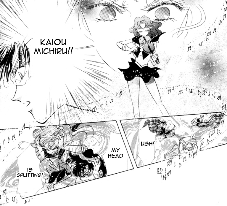 Then Neptune picks up the violin… and starts playing… super badly? This acts as a sound attack against the Senshi… what? So weird. Reminds me of Sailor Moon’s random crying attack from the very first act.