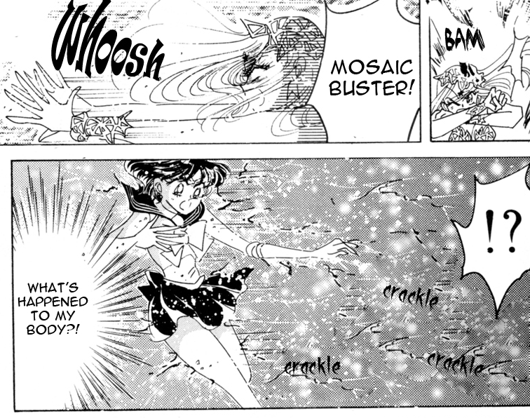 Too bad this doesn’t translate to battle. Mercury Aqua Mirage doesn’t do so well against Mosaic Buster. We get the nano bot threat just like the anime, but there will be no self-destruction today. Uranus will see to that.