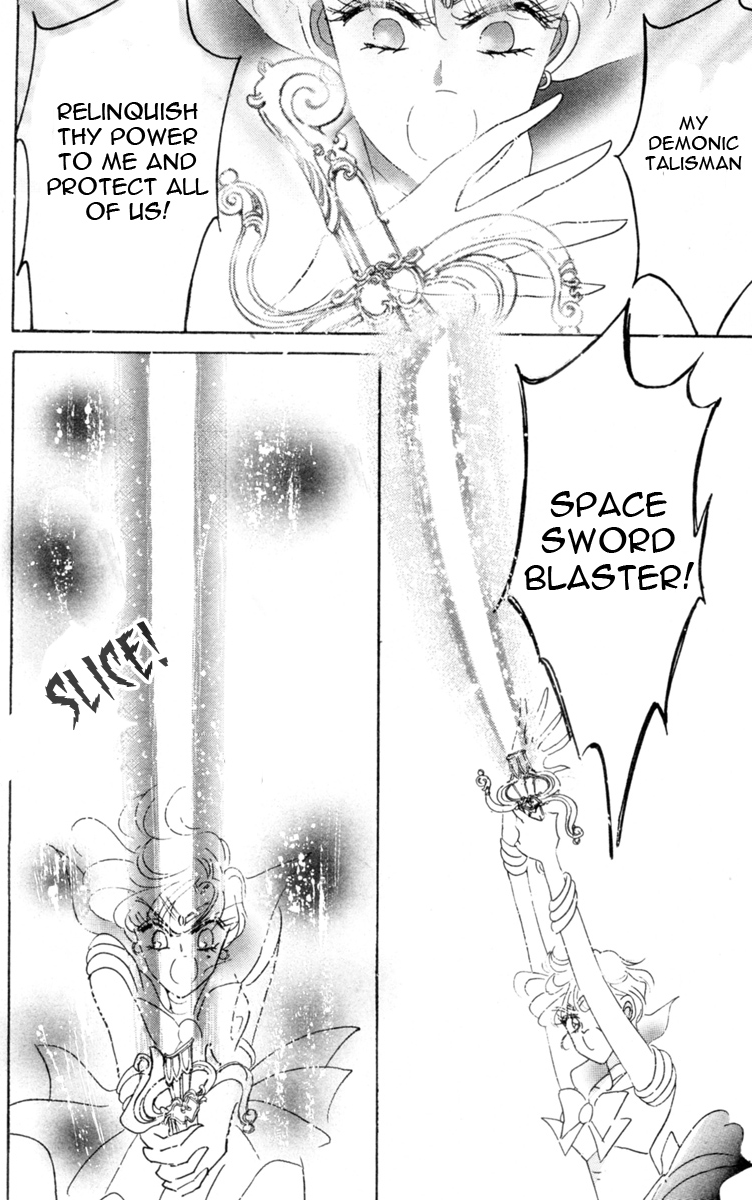 Sailor Moon arrives as Haruka and Michirutransform., and Uranus gives a bloody ace speech: “My demonic talisman, relinquish thy power to me and protect all of us! SPACE SWORD BLASTER!”
