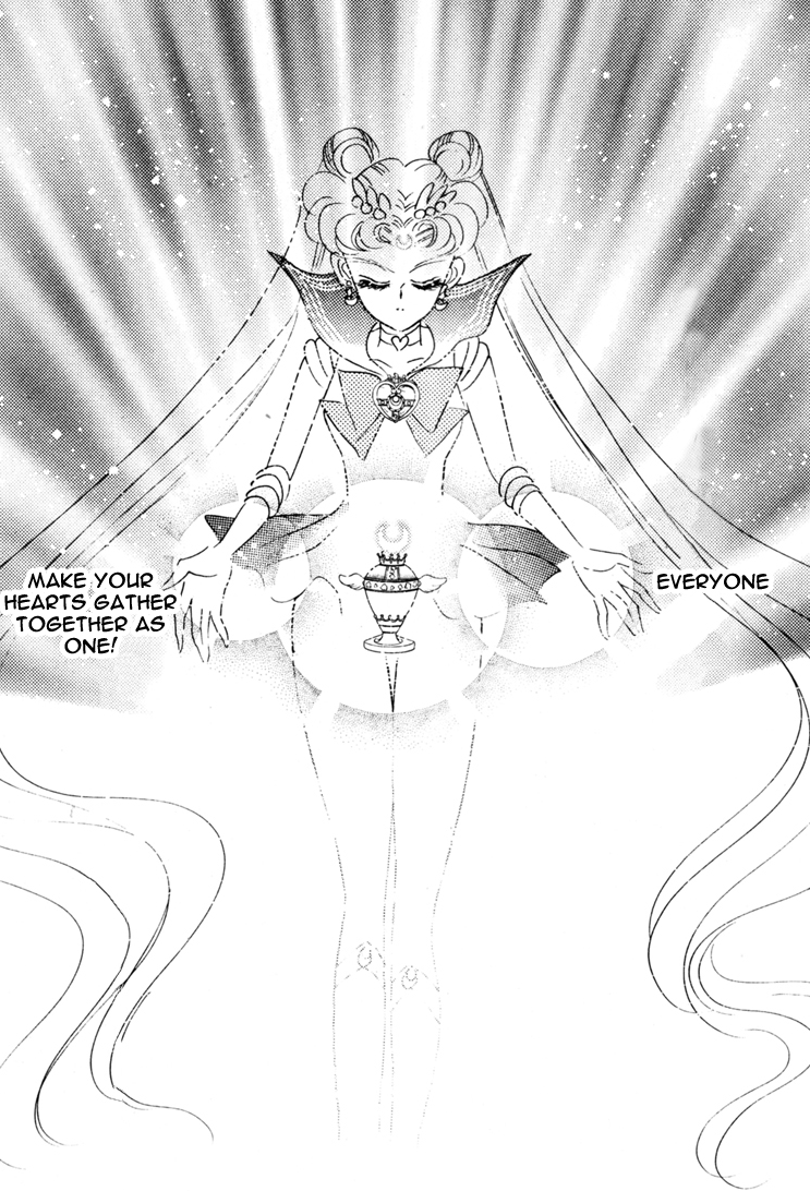 You may recall that we ended the previous arc with all the Senshi going insane and trying to murder each other. Inexplicably, Sailor Moon, Tuxedo Kamen and Sailor Chibi-Moon pull off a Captain Planet and combine their powers to form the Holy Grail. Shock!
