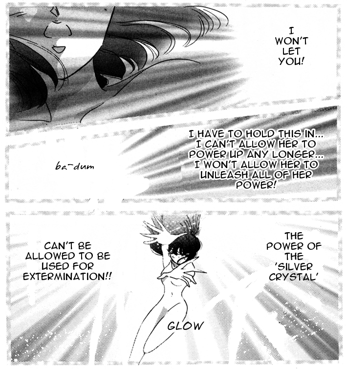 And we get Super Sailor Moon! It’s harder to tell the design differences in a black and white manga, but looking carefully you can see all the accoutrements she gains in the anime. Just like Sailor Moon to power up thanks to a change of clothes…