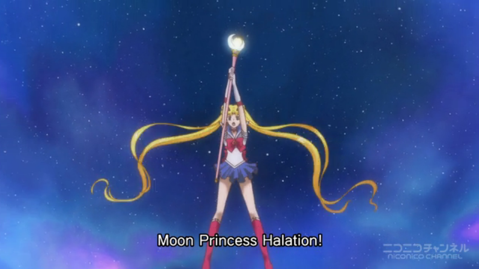 This is Moon Princess Halation. They’ve just ripped off Moon Healing Escalation from a few episodes ago, forgetting that Sailor Moon has a completely different weapon now. So evidently they just couldn’t be bothered to draw her new attack and shoved in old footage which they didn’t check for continuity purposes.