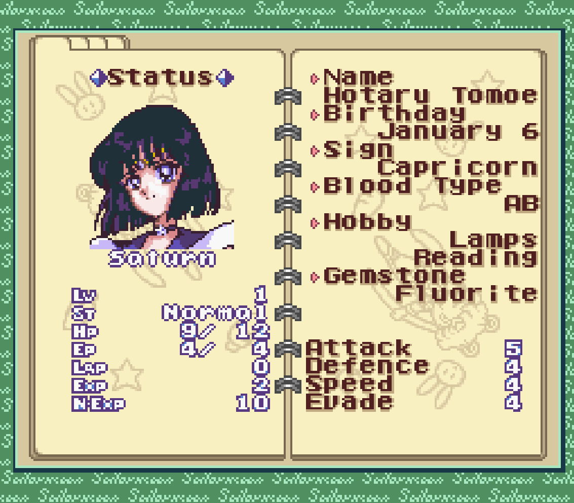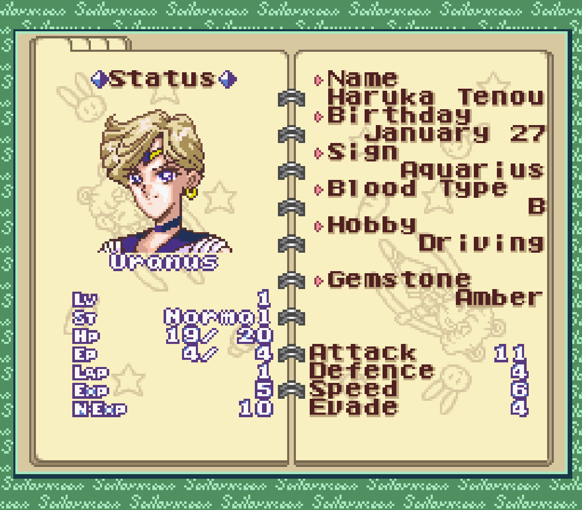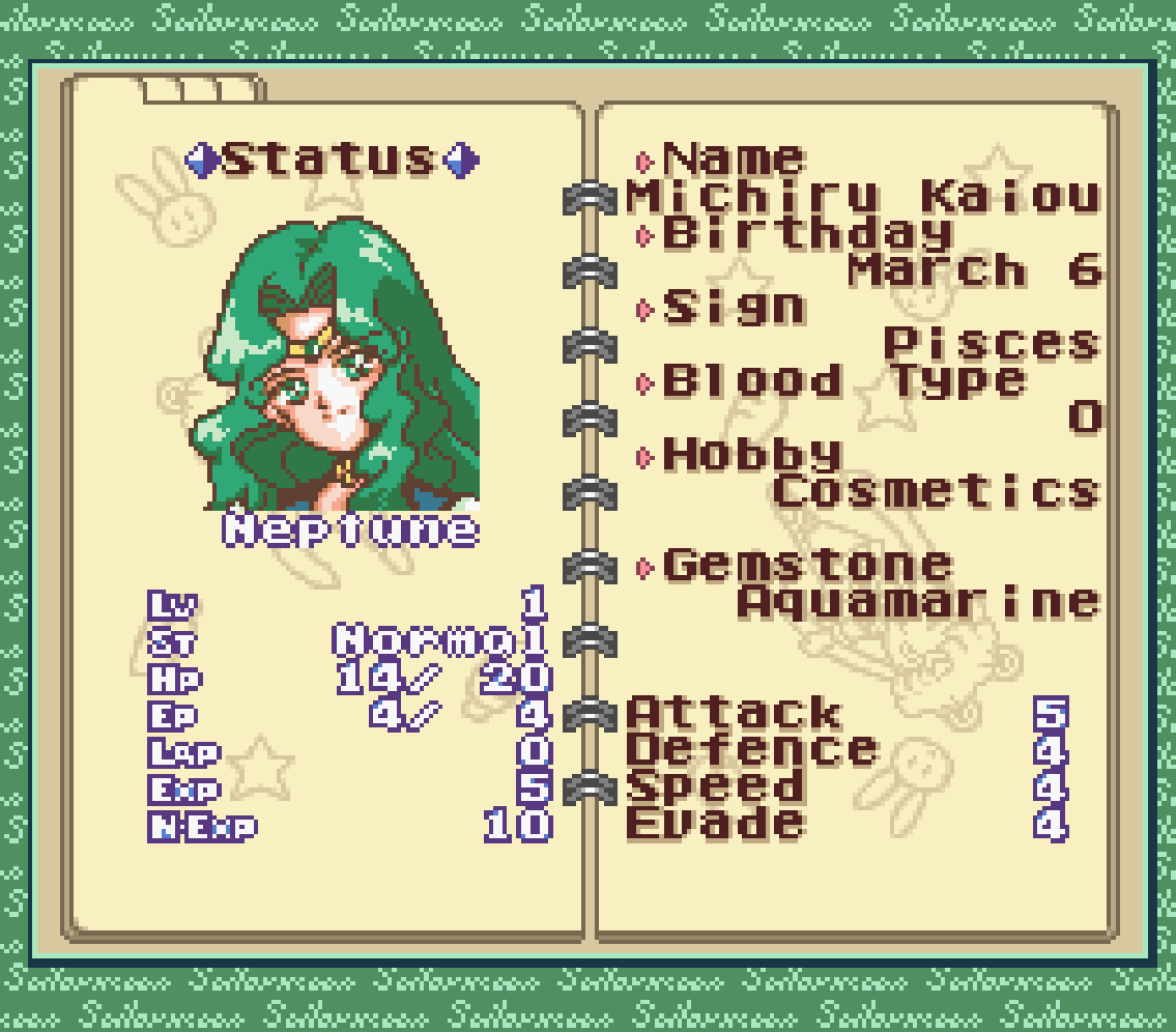 There’s also some fun stuff if you check the status of your party members. It’s rather fun, and perfect for obsessive fans like me who enjoy all the extra info on the Senshi. The blood type stuff is, of course, present. The “interests” section is quite perfunctory, but what you’d expect from the character’s we’ve come to know so well.