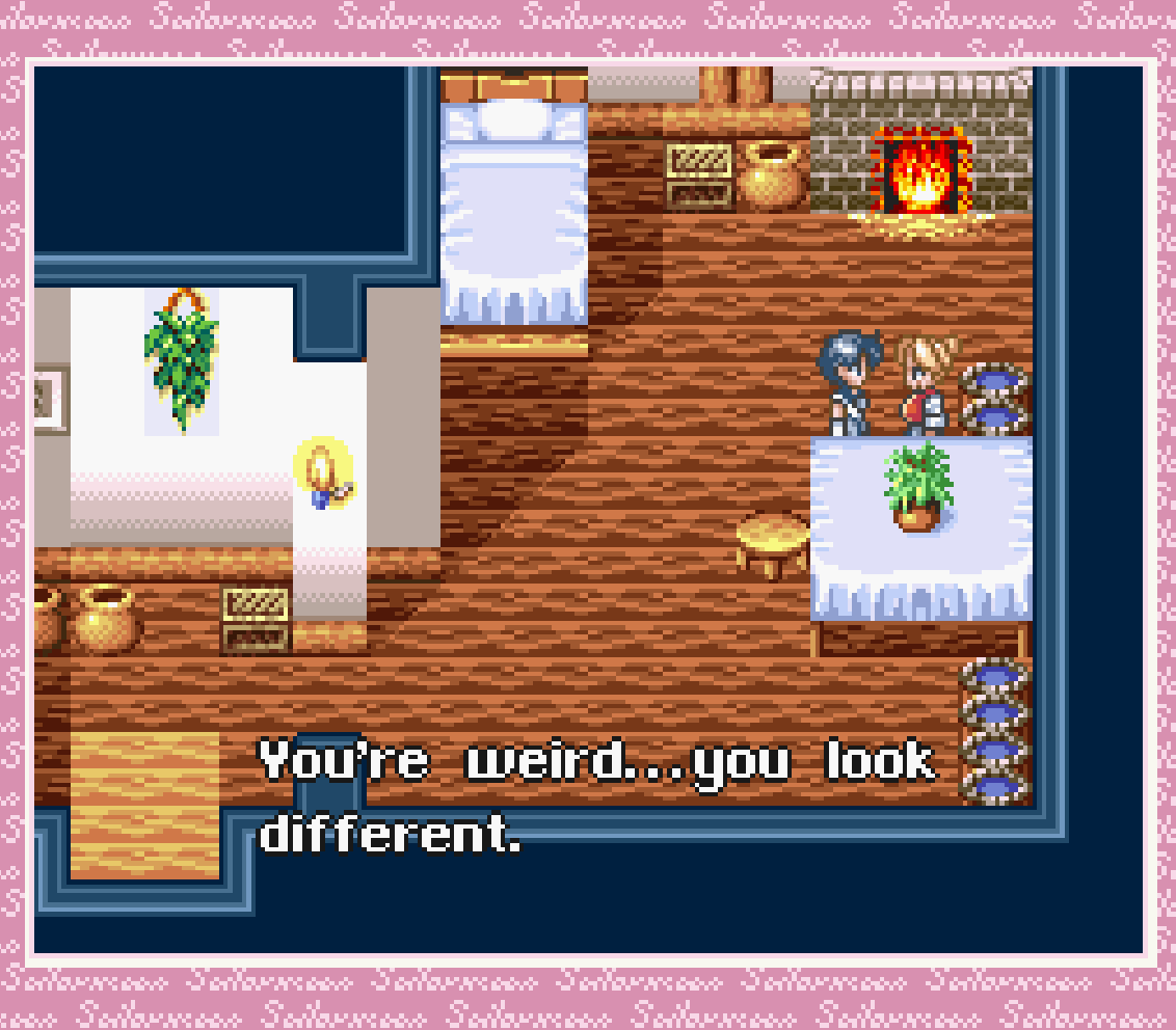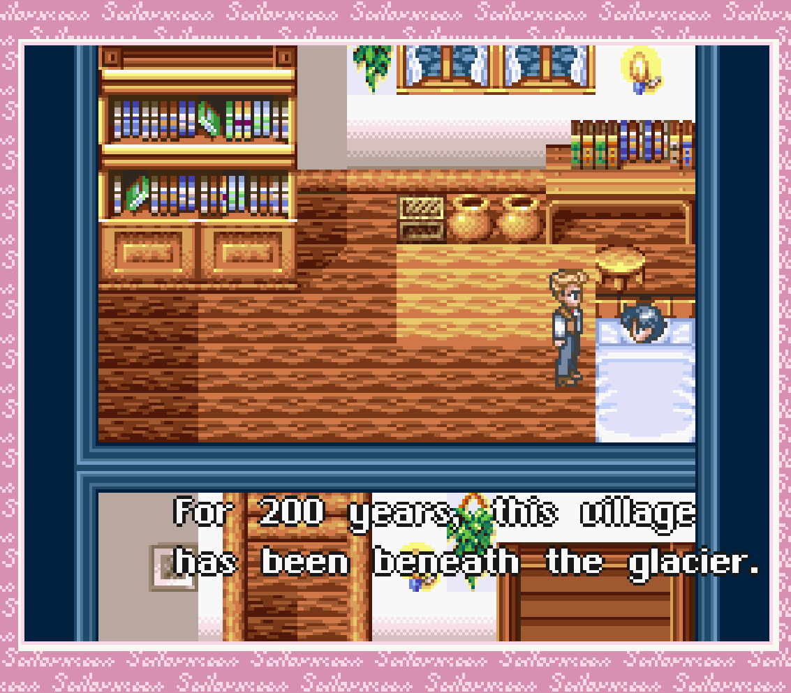 So, Hans tells Mercury when she wakes up that this village has been under the ice, out of contact from the rest of the world, for 200. You know how many questions this raises? I suspect this might be a detail that comes up again late in the game, but for now it’s just bizarre… It brings the aesthetic of this village close to that of Final Fantasy V or VI, that semi-medieval feeling. This would not be the only thing Another Story cribs off those games, of course.
