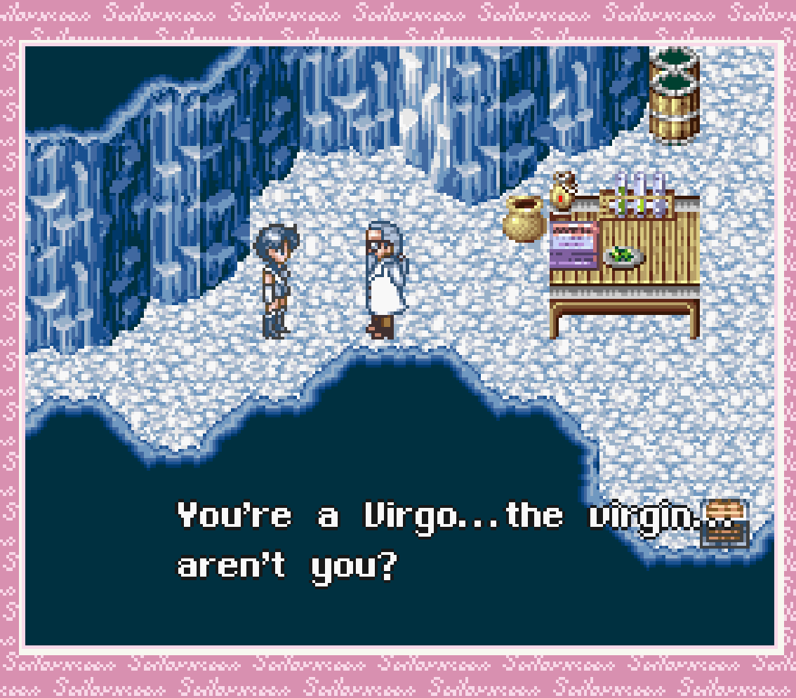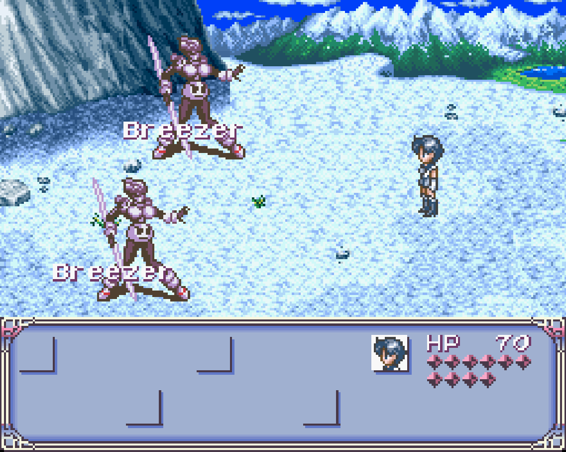 Schwatz is apparently in the next village over, which means navigating horrid thin identical corridors of ice and random encounters every 8 steps. That’s horrendous. Lucky the battles don’t last too long, even with lonely weakling Mercury. No offence, you’re just level 4.