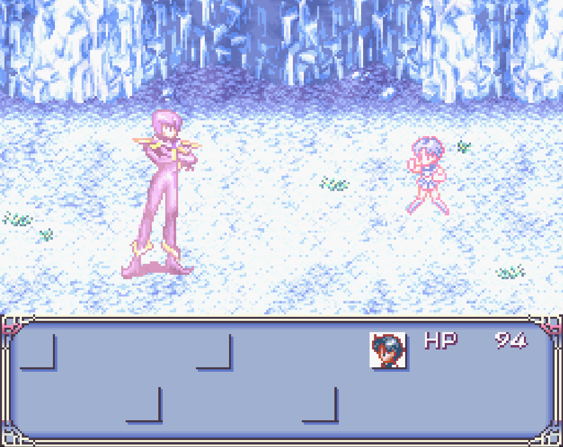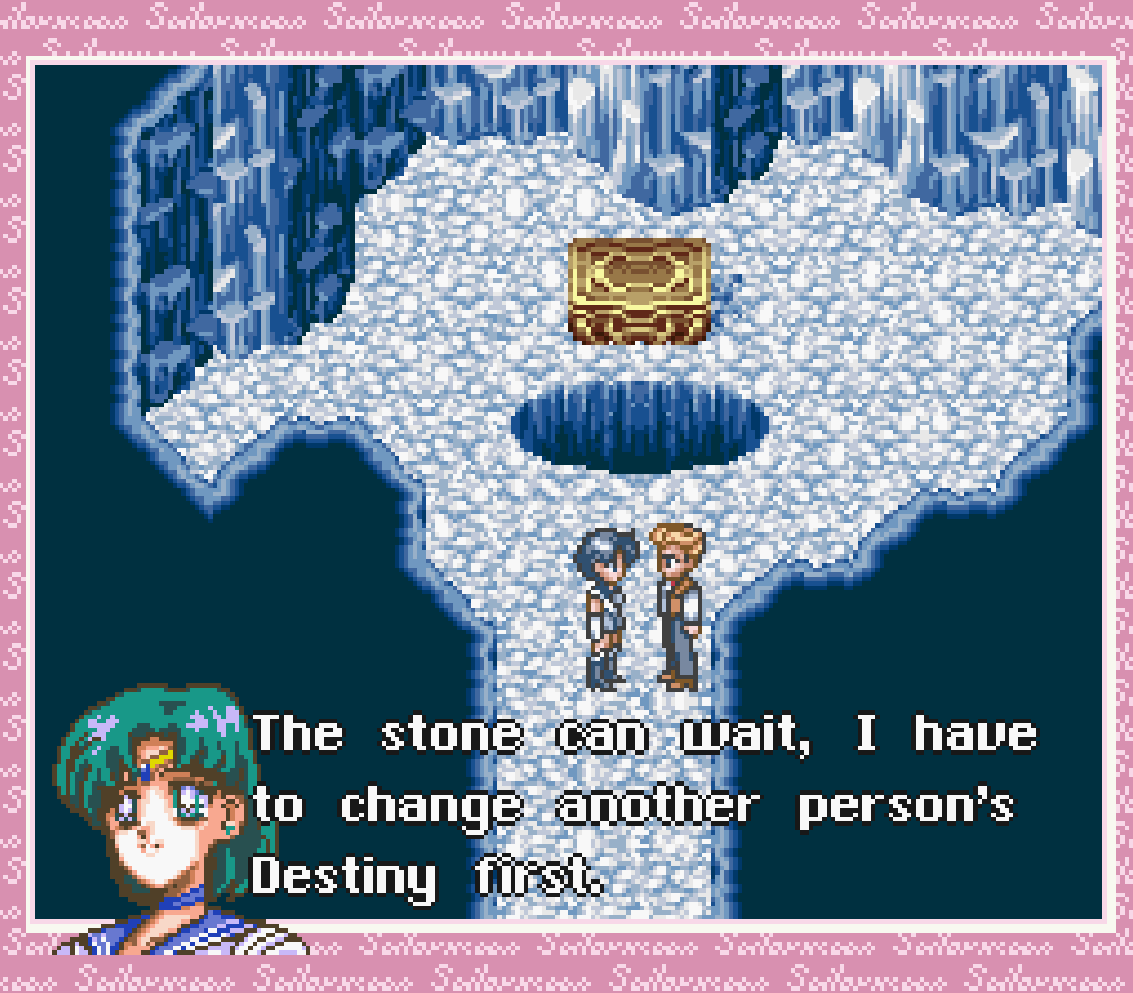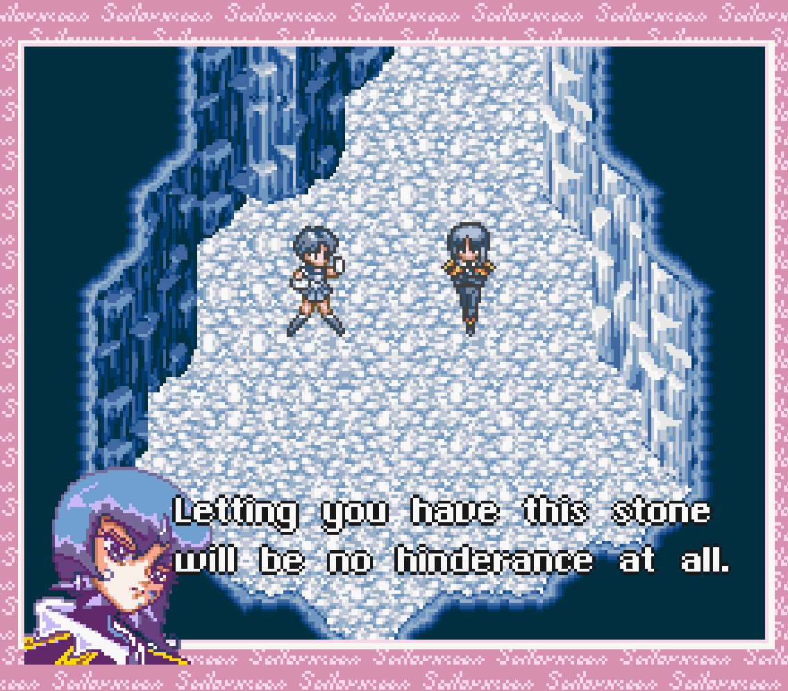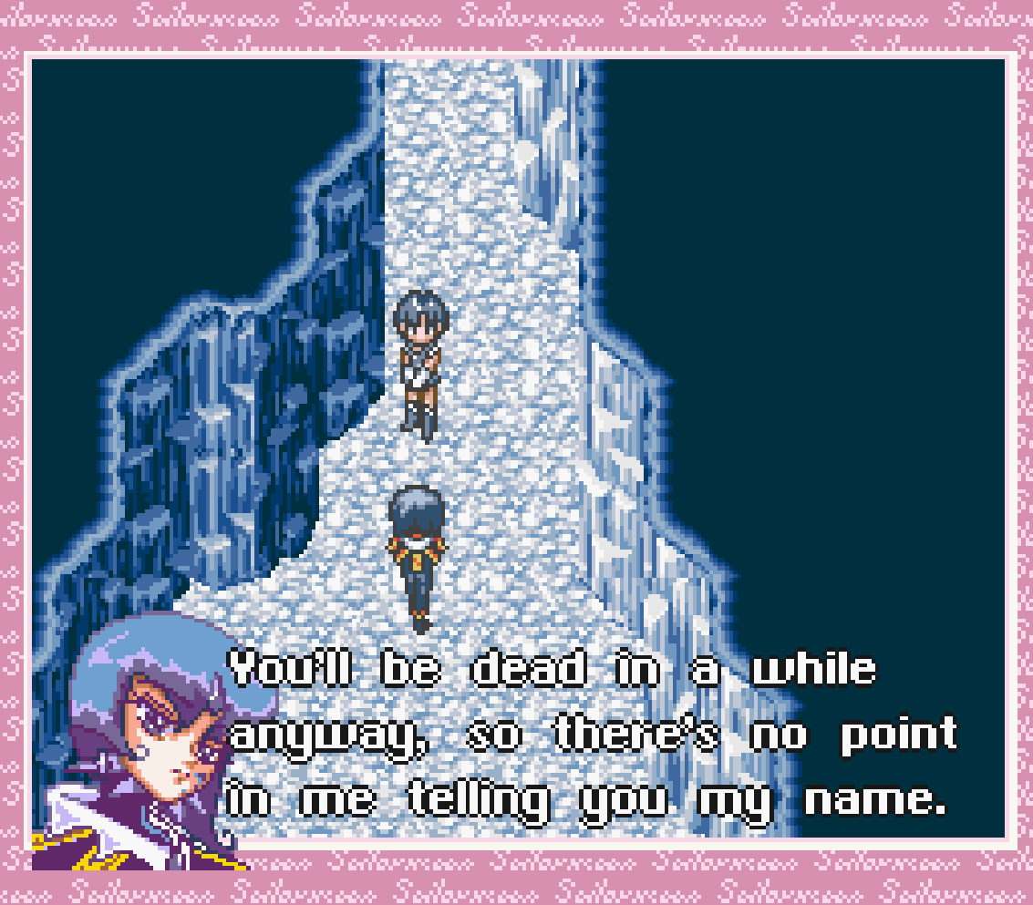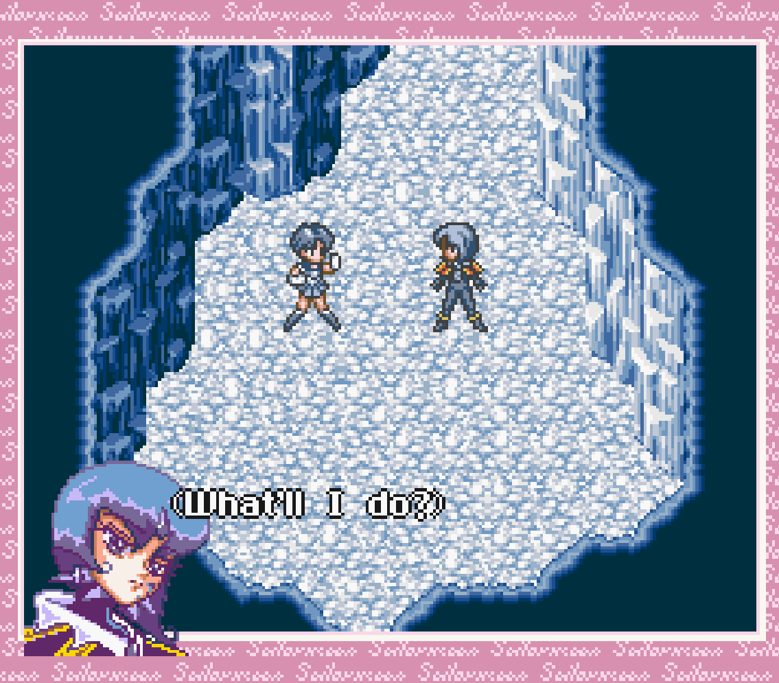 So! Sailor Mercury is in Switzerland. That’s not a bad gig. The place looks lovely, actually, this opening shot of Sailor Mercury atop a mountain with a lake below her is remarkably stunning, even in shitty 16 bit graphics. Unfortunately, this is the last time Sailor Mercury’s story is going to be attractive in any sense, because she’s attacked by Youma and sent off a cliff into a cave underneath the glacier… and she never leaves it. Well I guess glittering ice caves are easy to design?