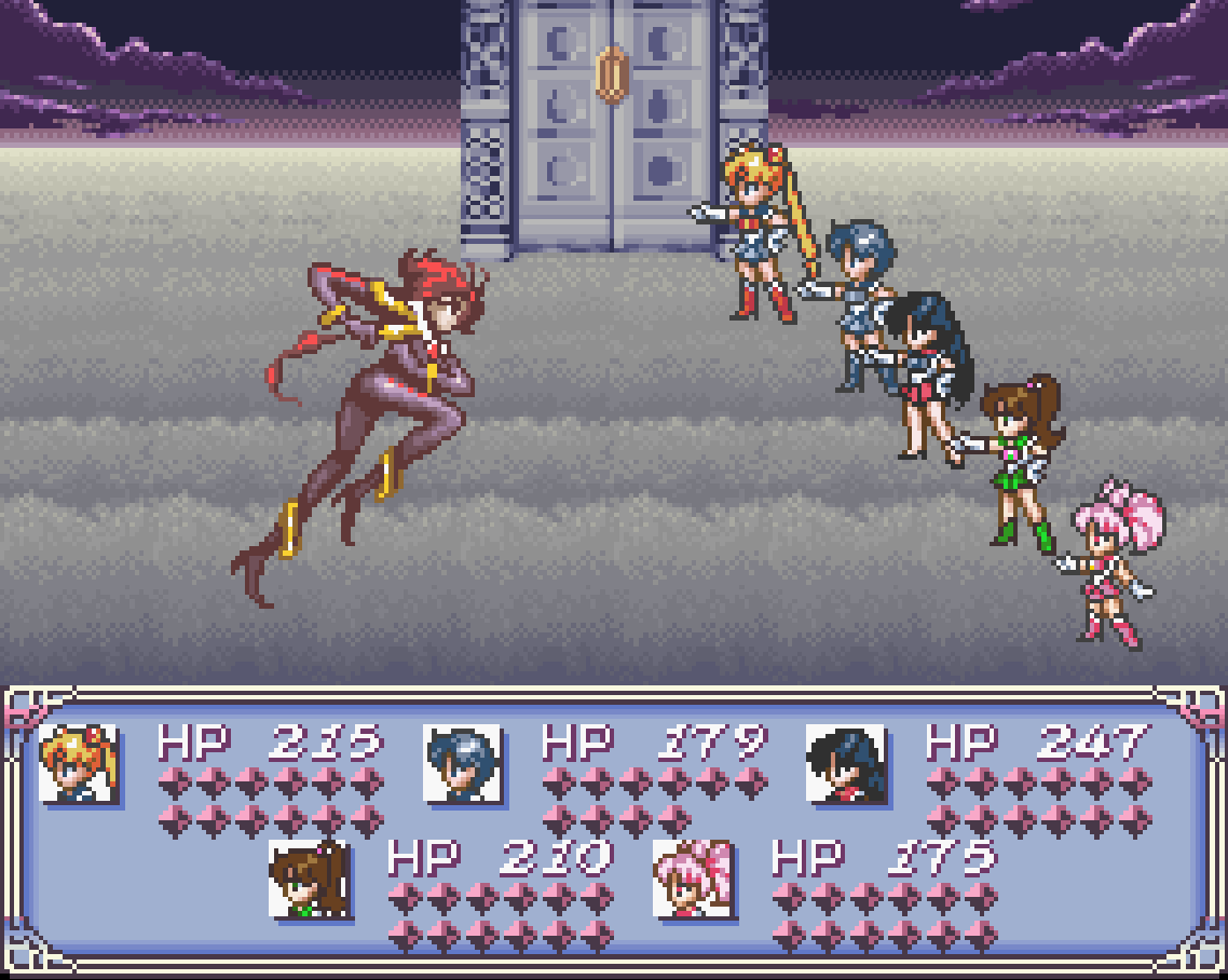 So it turns out that this is Nergal in disguise! He and Mars throw a few bits of trash talk at each other, which I presume we wouldn’t have gotten if I left Mars at home. Lucky! She’s a lot less tough in a party, but yeah the guys I took a long are a couple of levels too low for this I think. This whole stolen identity part is a reference to the episode of Sailor Moon R in the Space-Time Corridor, which is pretty cool.