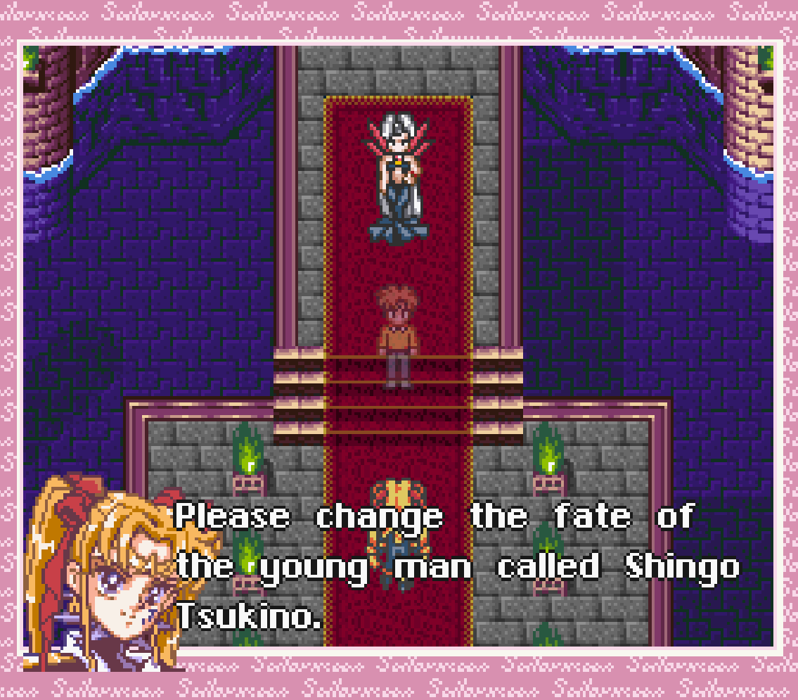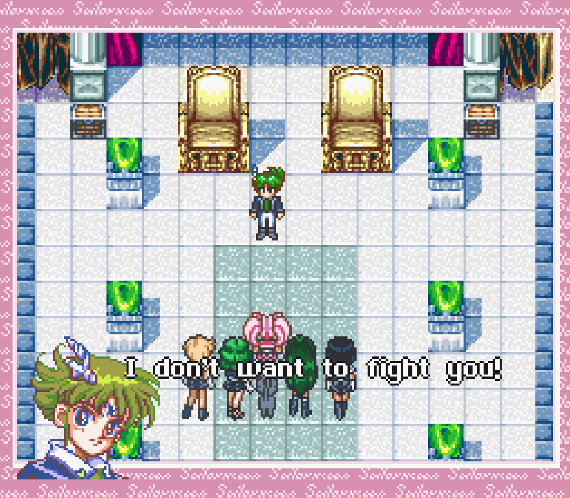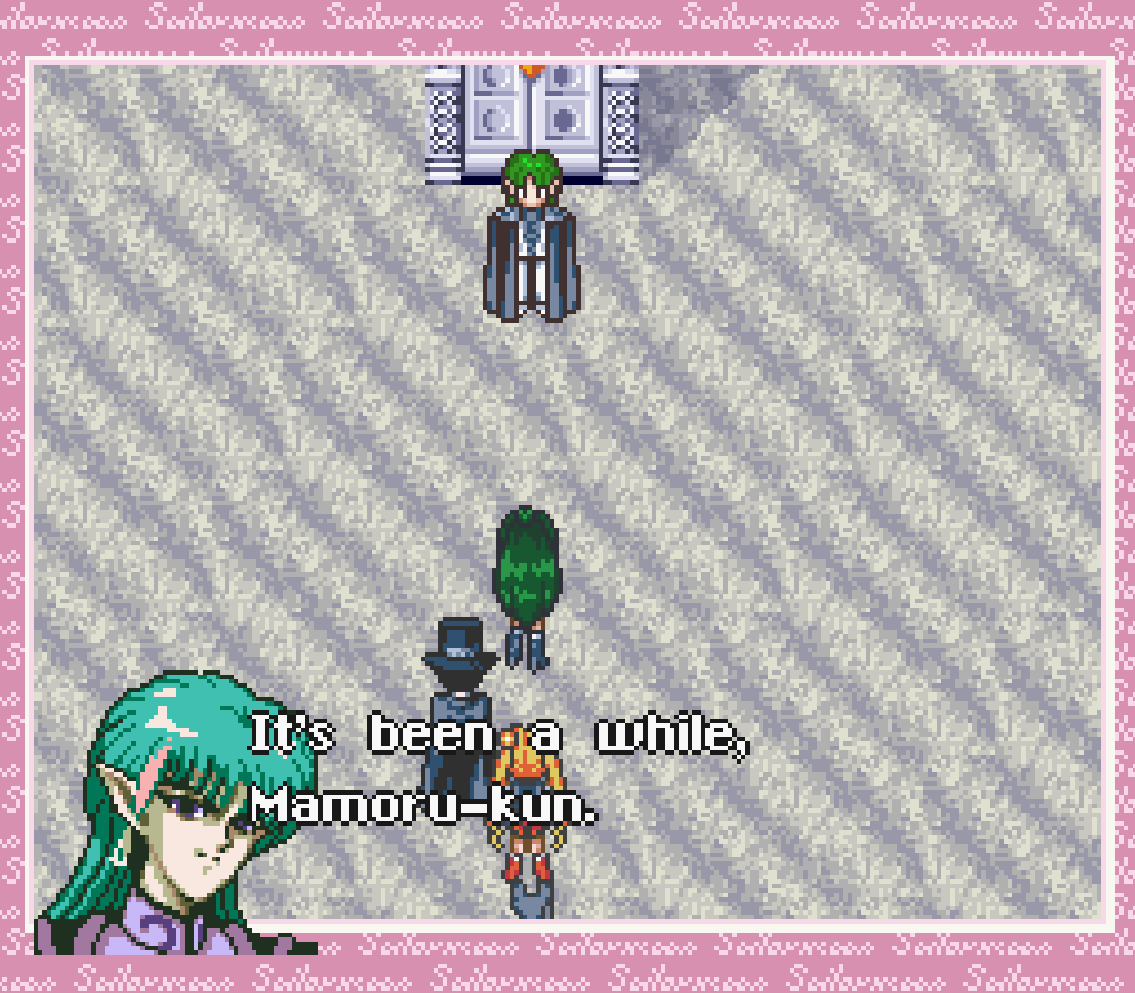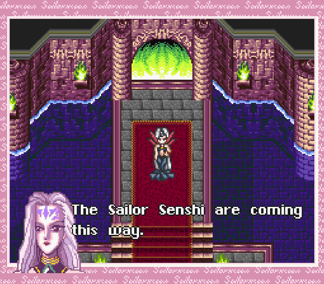 The Crystal Palace has an energy field around it, hearkening back to Sailor Moon R, except this time you’re on the outside. Anshar is refusing to let you in because, if you do, he’ll have to fight you and poor widdle baby boy loves Chibi-Usa too much. Well how about you just stop being a dick then?