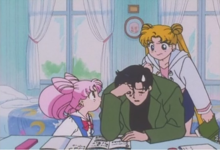 I love this opening. It’s rather classic, actually, hearkening back to the awkward threes-company situations of Sailor Moon R. Mamoru is helping Chibi-Usa with her math problems when Usagi becomes insanely jealous, butting in with her own work book in order to score attention. Chibi-Usa points out that Usagi is trying to shove an upside-down book in Mamoru’s face and… well… yelling ensues.