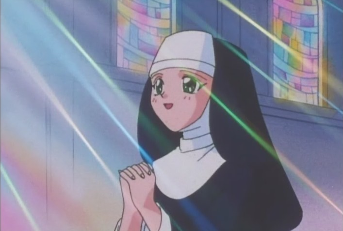 We cut to this very nun giving the Lord’s Prayer in a church, and I’m reminded strongly of Sailor Moon S. I wonder whatever happened to that monstrosity of a marine cathedral off the coast of Tokyo supposedly being built… It’s interesting to hear the words I used to have to say daily at school as a kid (I was raised Catholic) translated into Japanese. I’m fairly certain that at no point in my brief ecclesiastical tenure did I ever look this happy reciting a prayer.