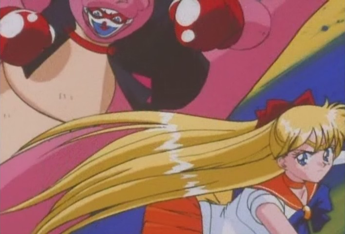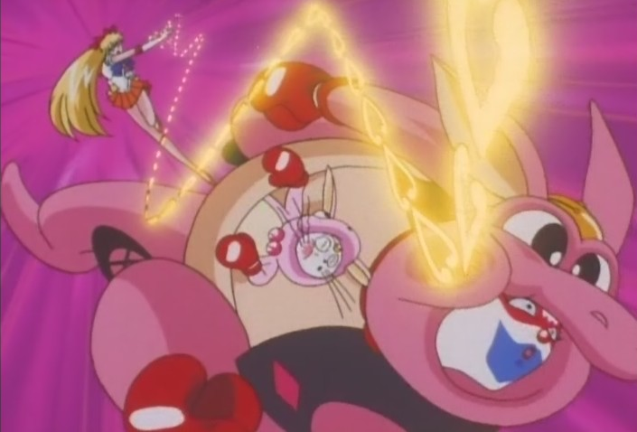 Ok now she’s a giant kangaroo boxer… I know Sailor Moon monsters are weird, but this feels disjointed too. So yeah, they’re playing on that same pun as before I believe, but it’s hard to tell.