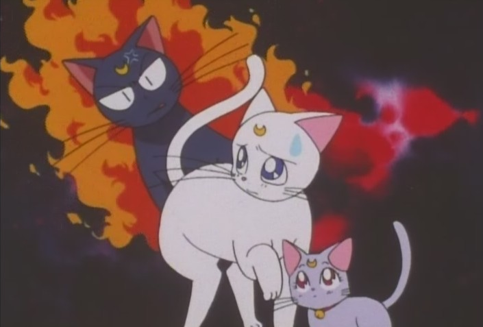 You know, there’s some rather mature subject matter in here today. The constant implication is that Artemis has had his end away with another cat, one which we can presume is not a talking cat since they aren’t that common. So what, is that bestiality? He’s sentient, wouldn’t it be rather inappropriate for him to mate with an alley cat? Are Artemis and Luna destined, nay forced, to procreate with one another simply because there is no alternative given to them? Yes, this is what goes though my head when I watch Sailor Moon.