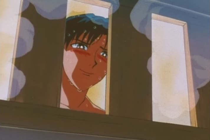 Hearing Rei’s precious screams of shock (and awe, undoubtedly) Yuichiro runs in to save her honour. After Rei is done kicking his ass to the floor so she can run back to her room and whip out the old biology textbook, Yuichiro turns to Mamoru who is, I should remind you, still naked and in the tub.